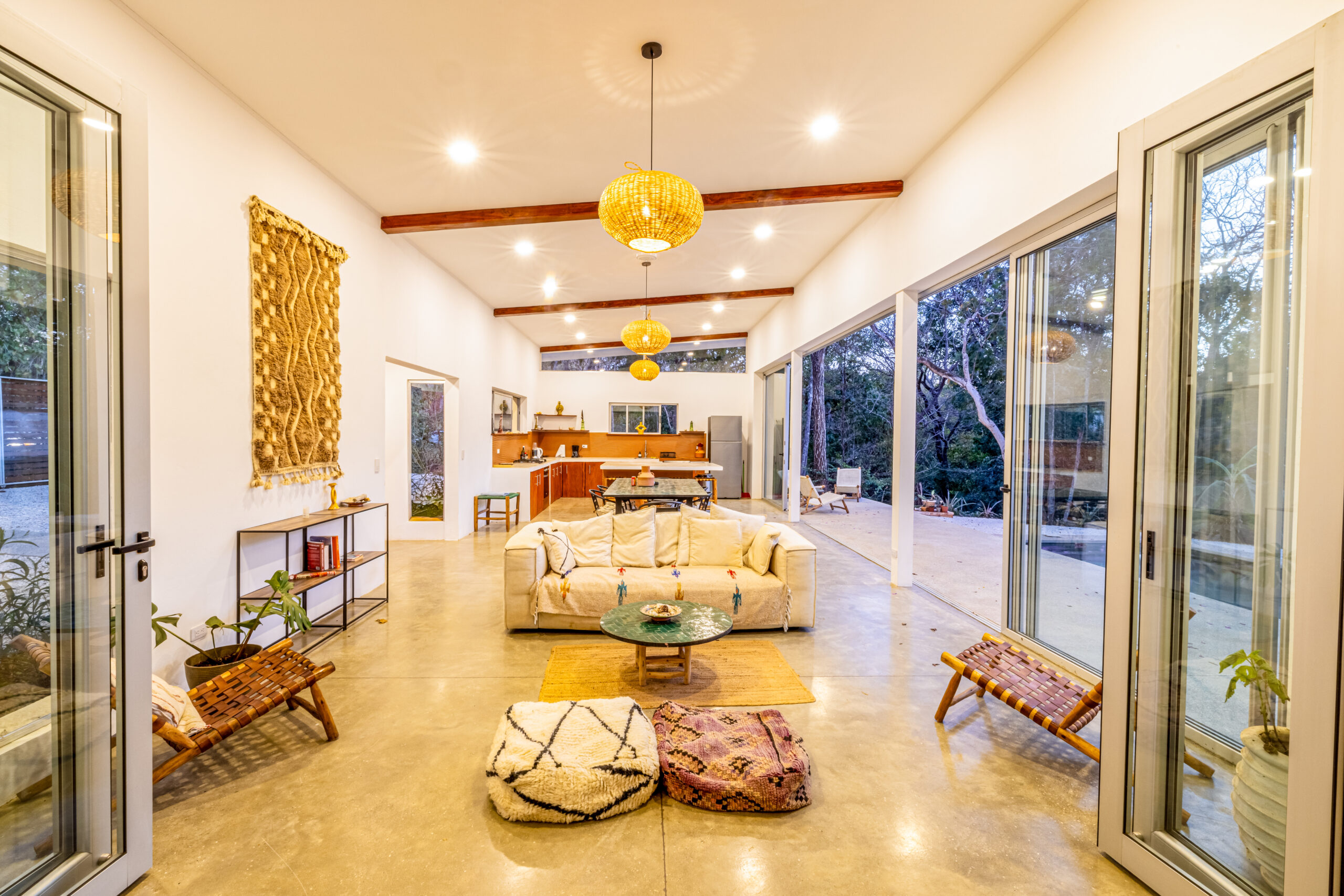 Outside, enjoy your private swimming pool, landscaped gardens, and large patio surrounded by nature — plus a seasonal creek and relaxing ocean sounds, especially at night.